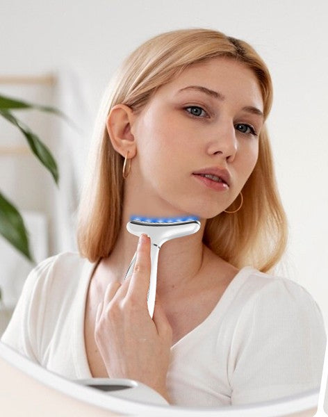 Ligue o aparelho e escolha LED + EMS + Calor. Comece na intensidade baixa e ajuste ao conforto. -