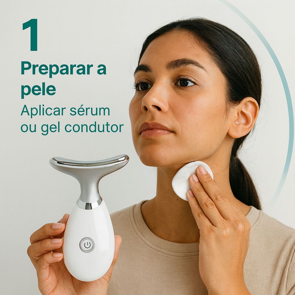 Limpe e seque a pele. Aplique uma camada fina de sérum/gel condutor no pescoço e queixo. -