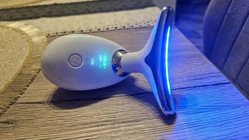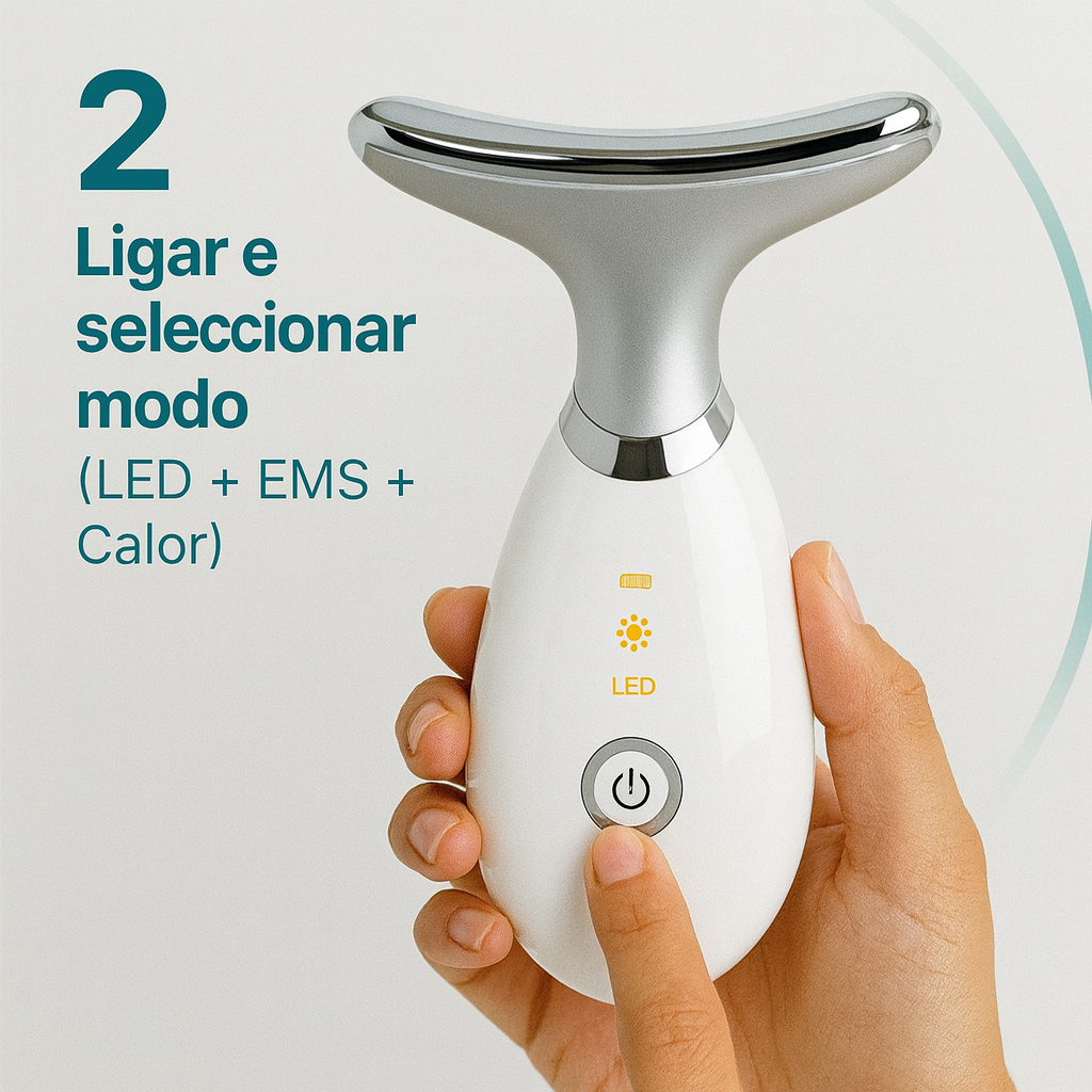 Ligue o aparelho e escolha LED + EMS + Calor. Comece na intensidade baixa e ajuste ao conforto. -