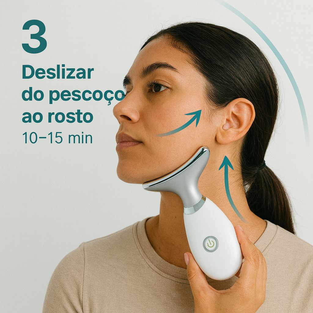 Deslize de baixo para cima, do pescoço ao rosto, por 10–15 minutos, com movimentos lentos e contínuos.